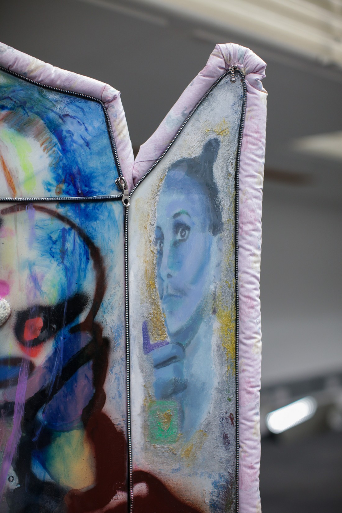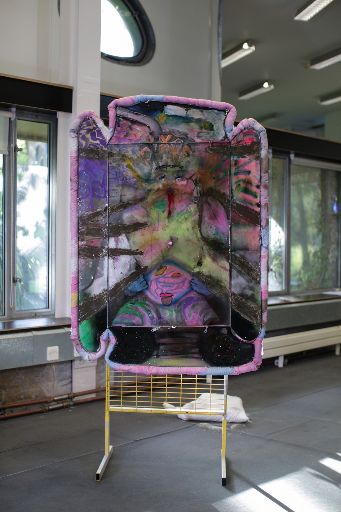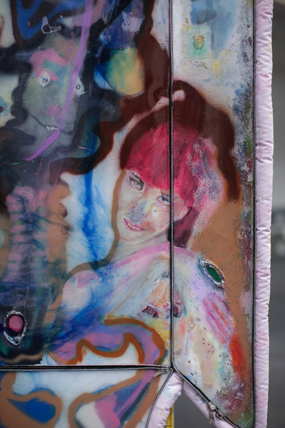 paintings are coated in resin, plastered with pigment and spray, framed with metal zips