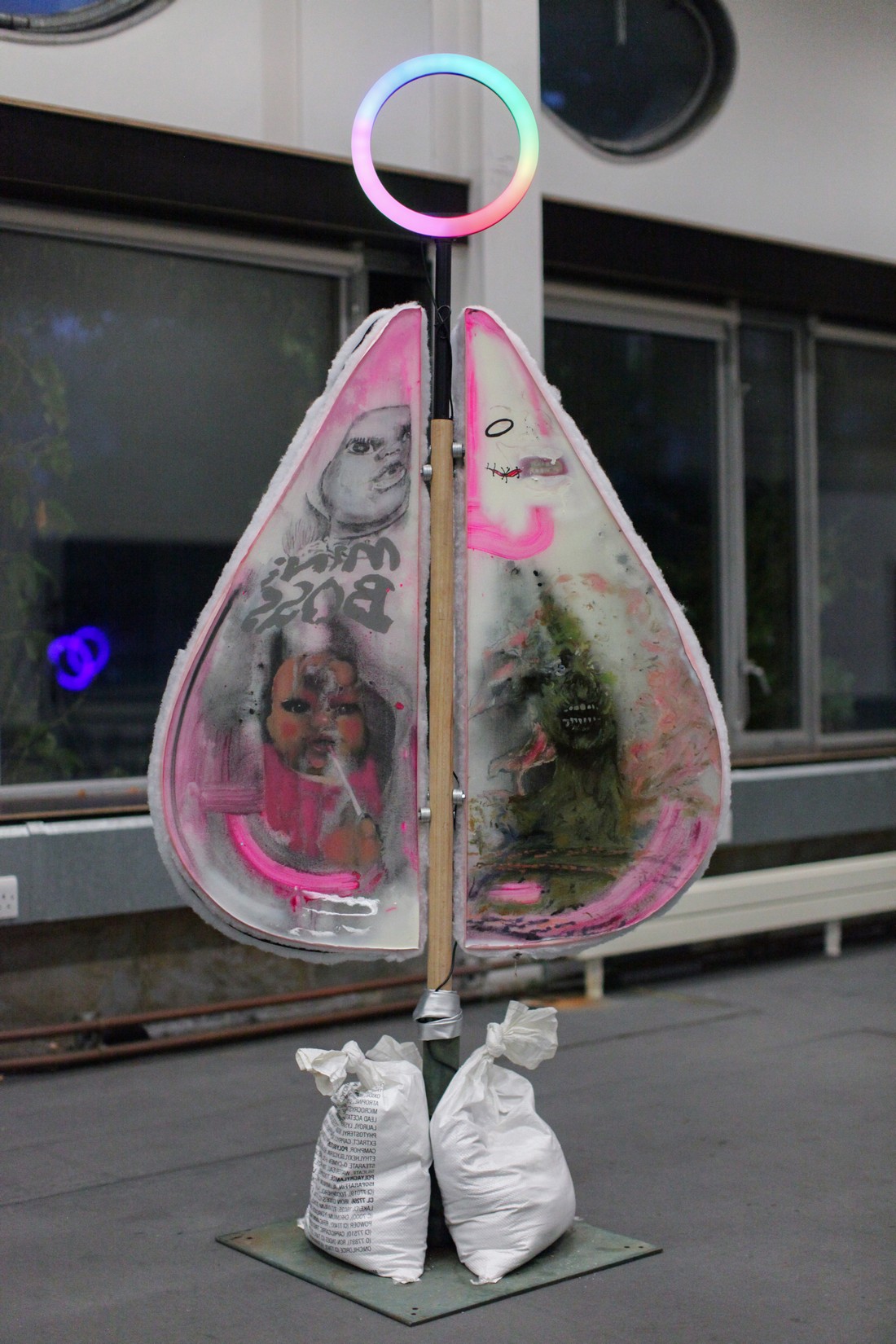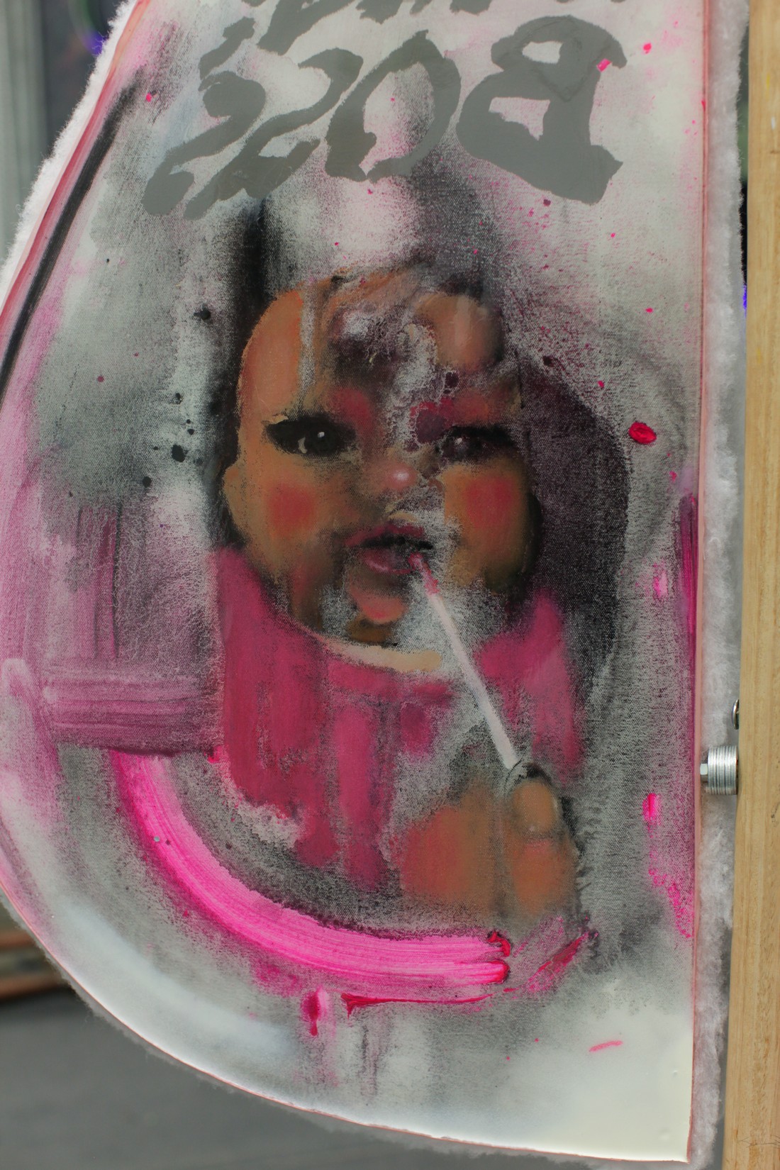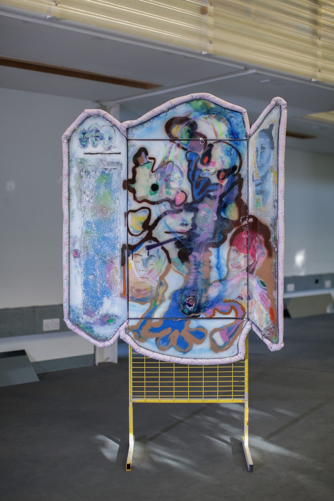 paintings are coated in resin, plastered with pigment and spray, framed with metal zips
