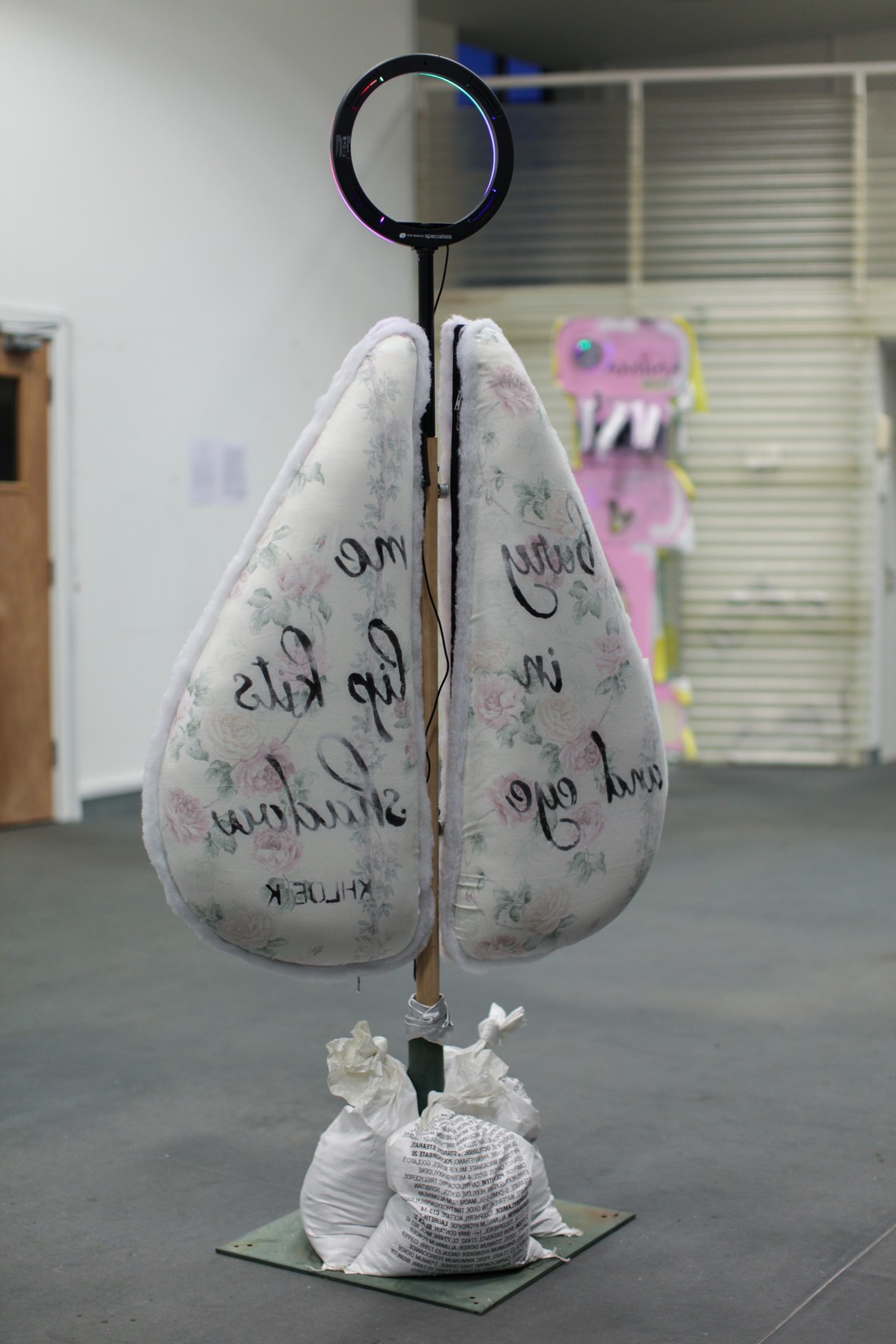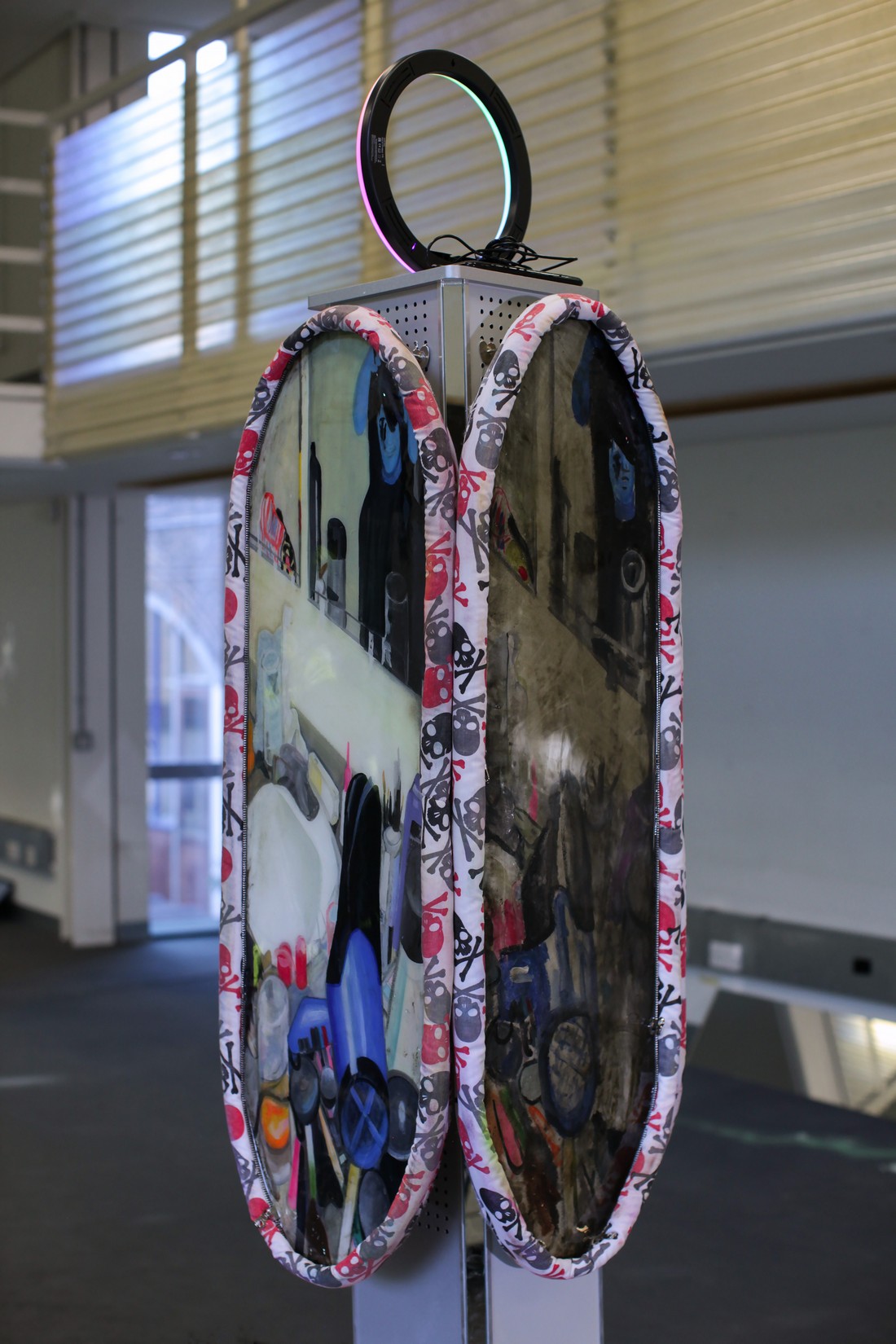 and mounted on metal shop display units and ring lights like reflective obstructions. The