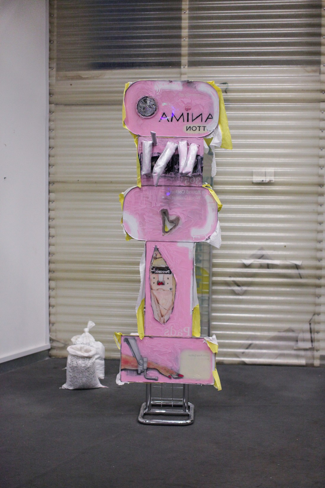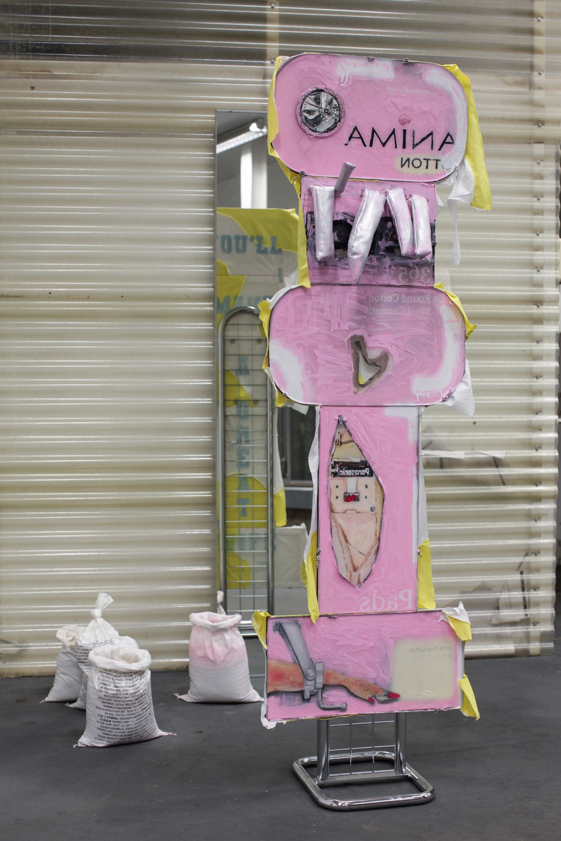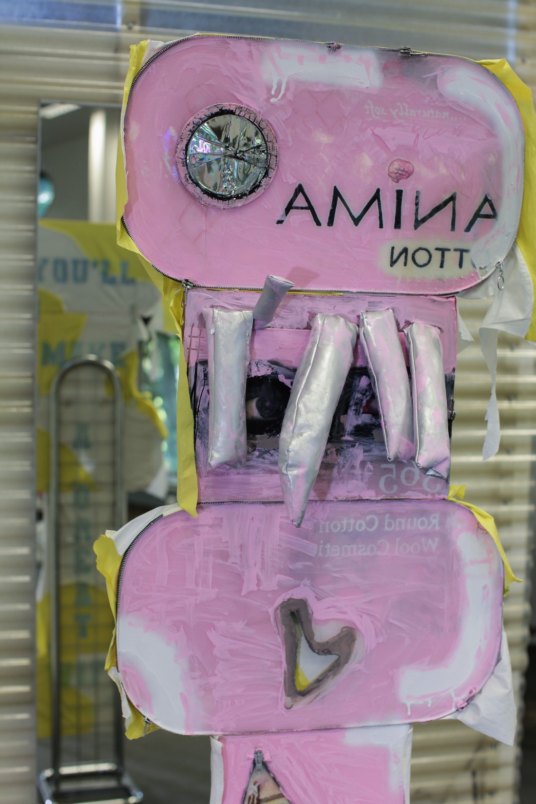 sculptures which assemble into a zombie-commercial shop display of textiles, metal,