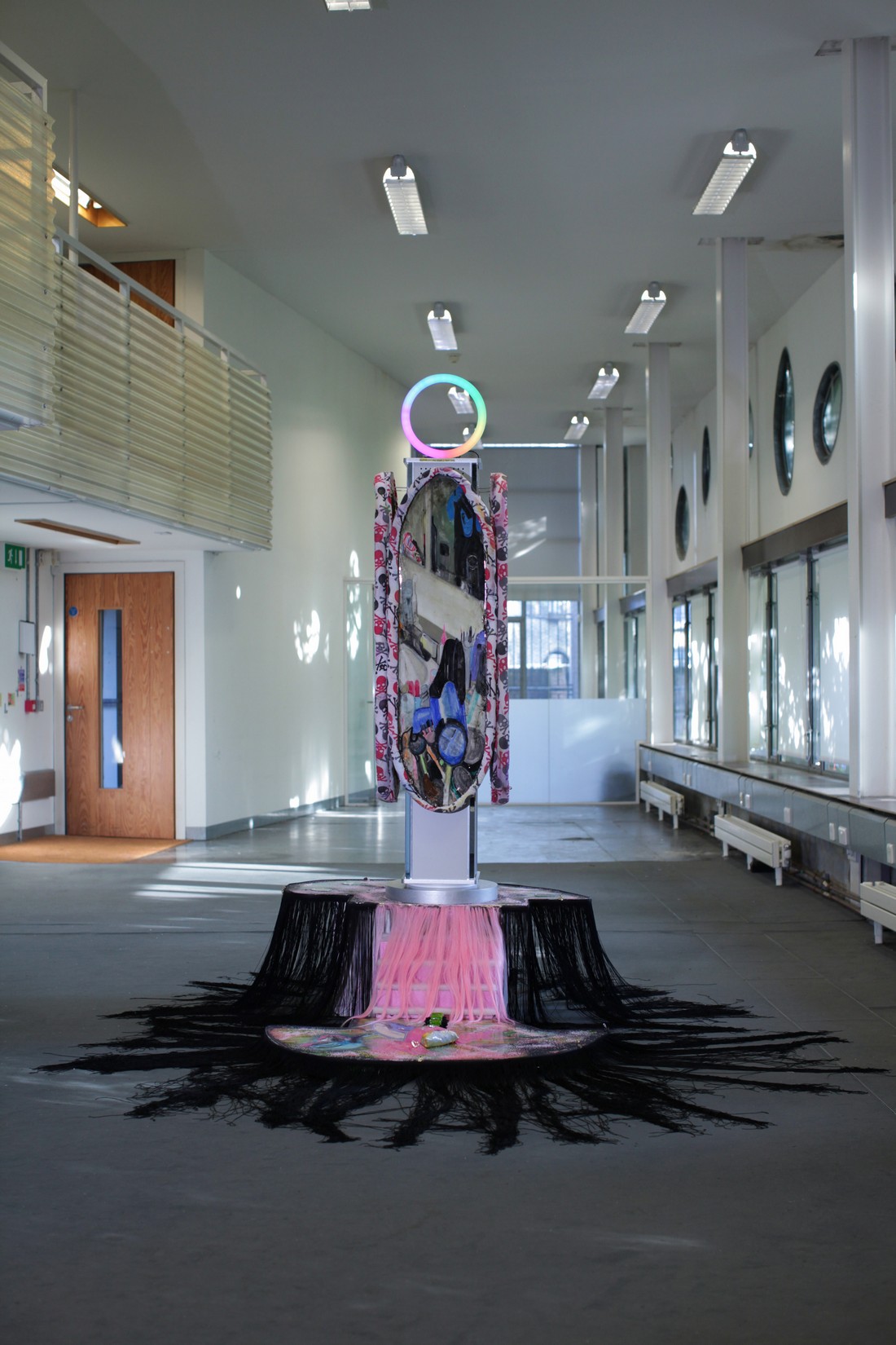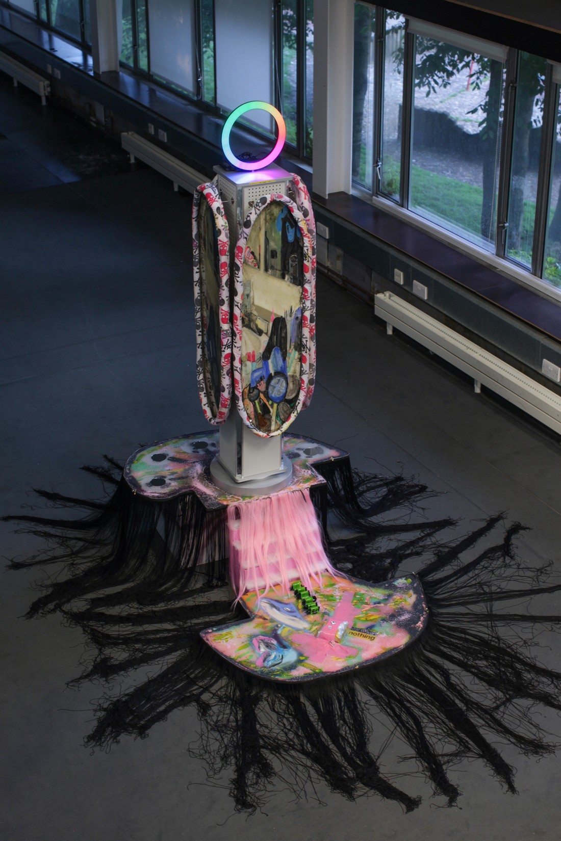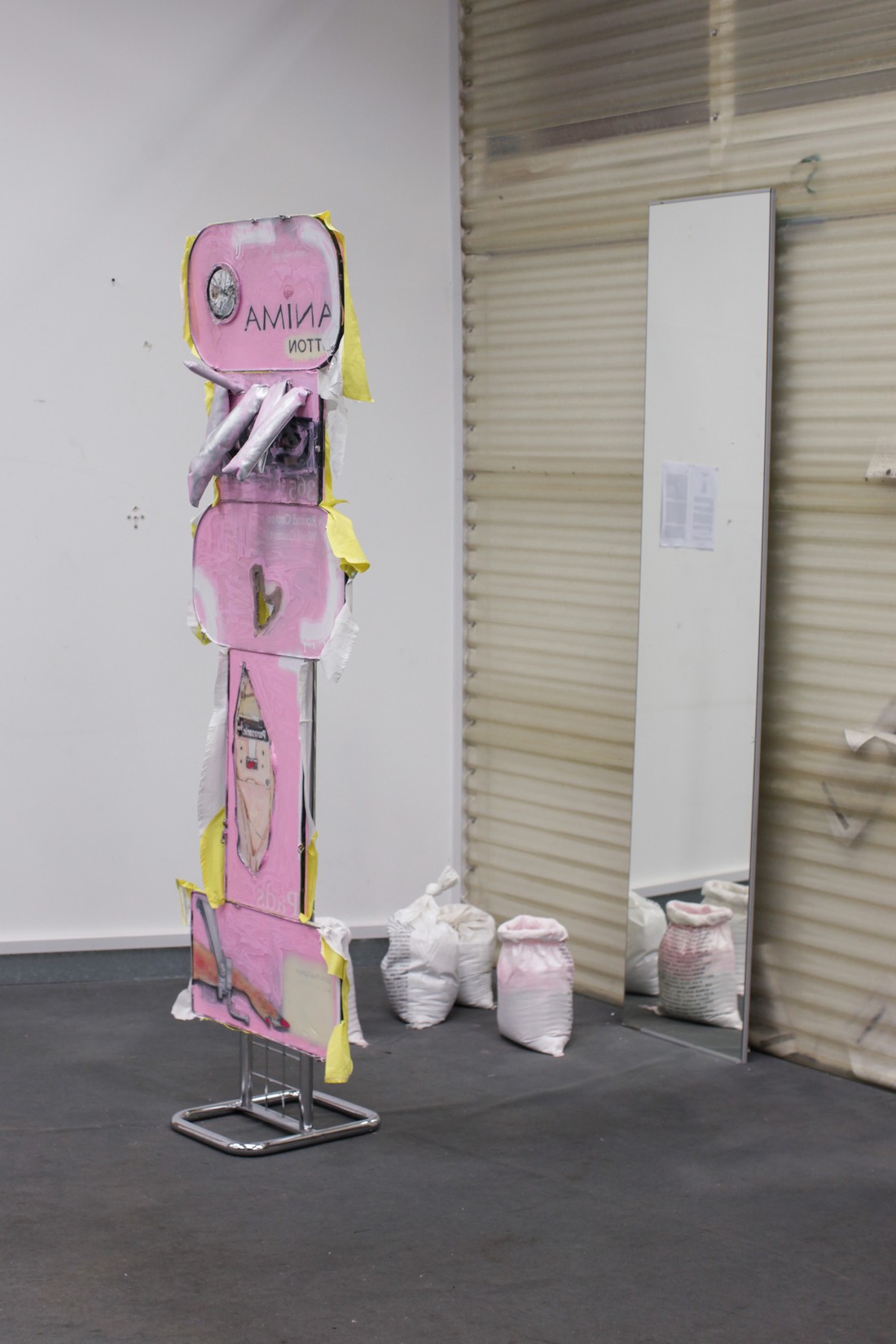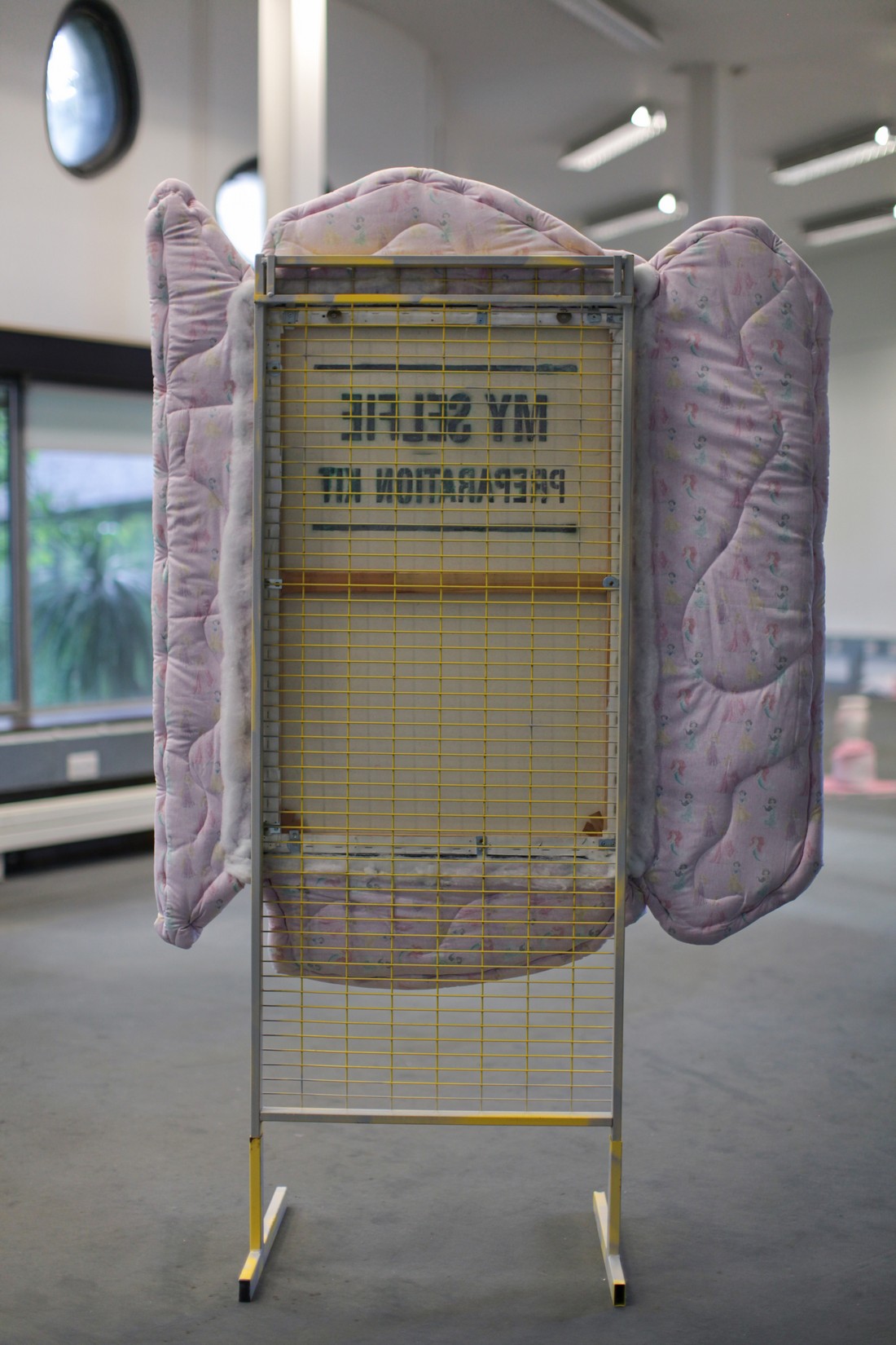 sculptures which assemble into a zombie-commercial shop display of textiles, metal,
