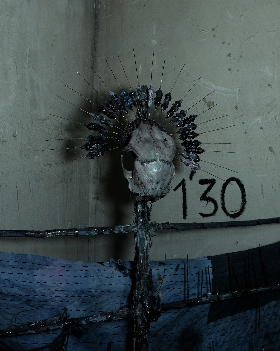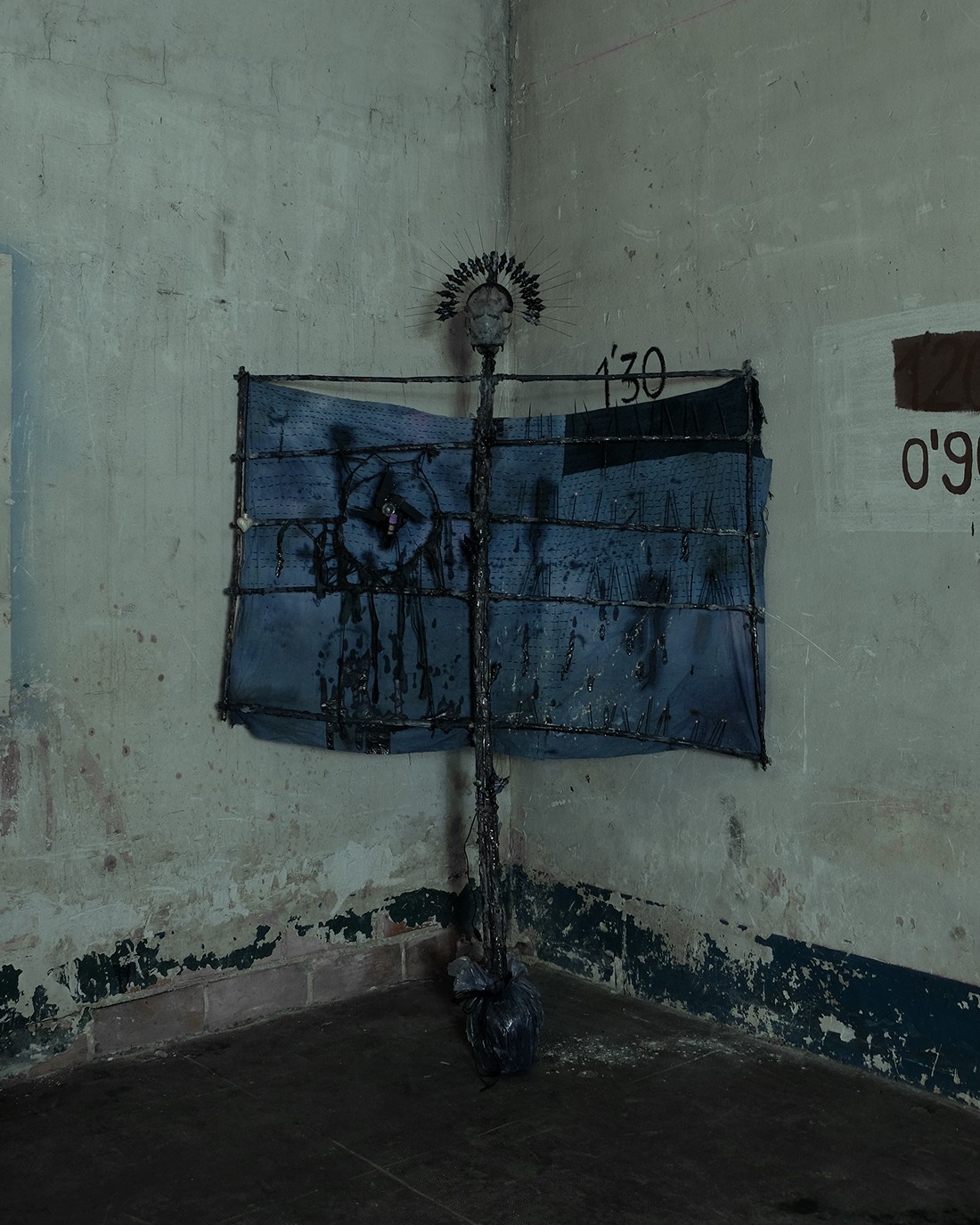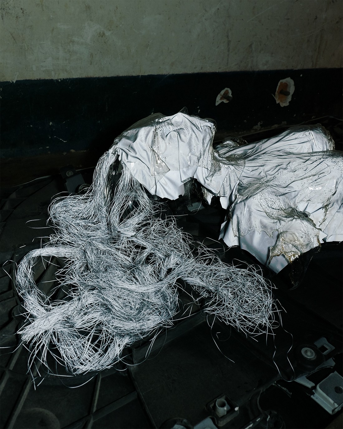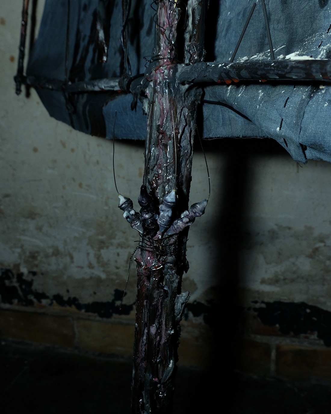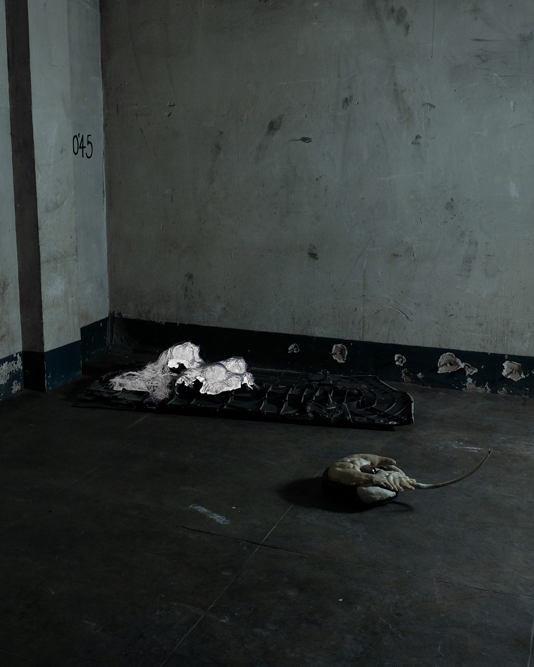 The first piece, a post-apocalyptic flag, looms in the shadows. The skull, pierced by needles, seems to solemnly preside over the scene, while the blood collection tube attached to the rotating fan stirs the air. Burning incense sticks cast a dim glow, their scent permeating the space with an uneasy nostalgia. Wandering through the darkness, an unexpected sight greets visitors: a horseshoe crab fused with a Roomba. This peculiar marriage of ancient and modern roams the venue, inviting contemplation on the passage of time and the merging of the natural and the artificial. Further along the path, the fragmented silhouette of a dismembered body materializes. Crafted from reflective fabric, the figure rests atop a discarded truck part. The sculpture, shimmering in the faint light, appears to be searching for solace in a world where comfort is scarce.