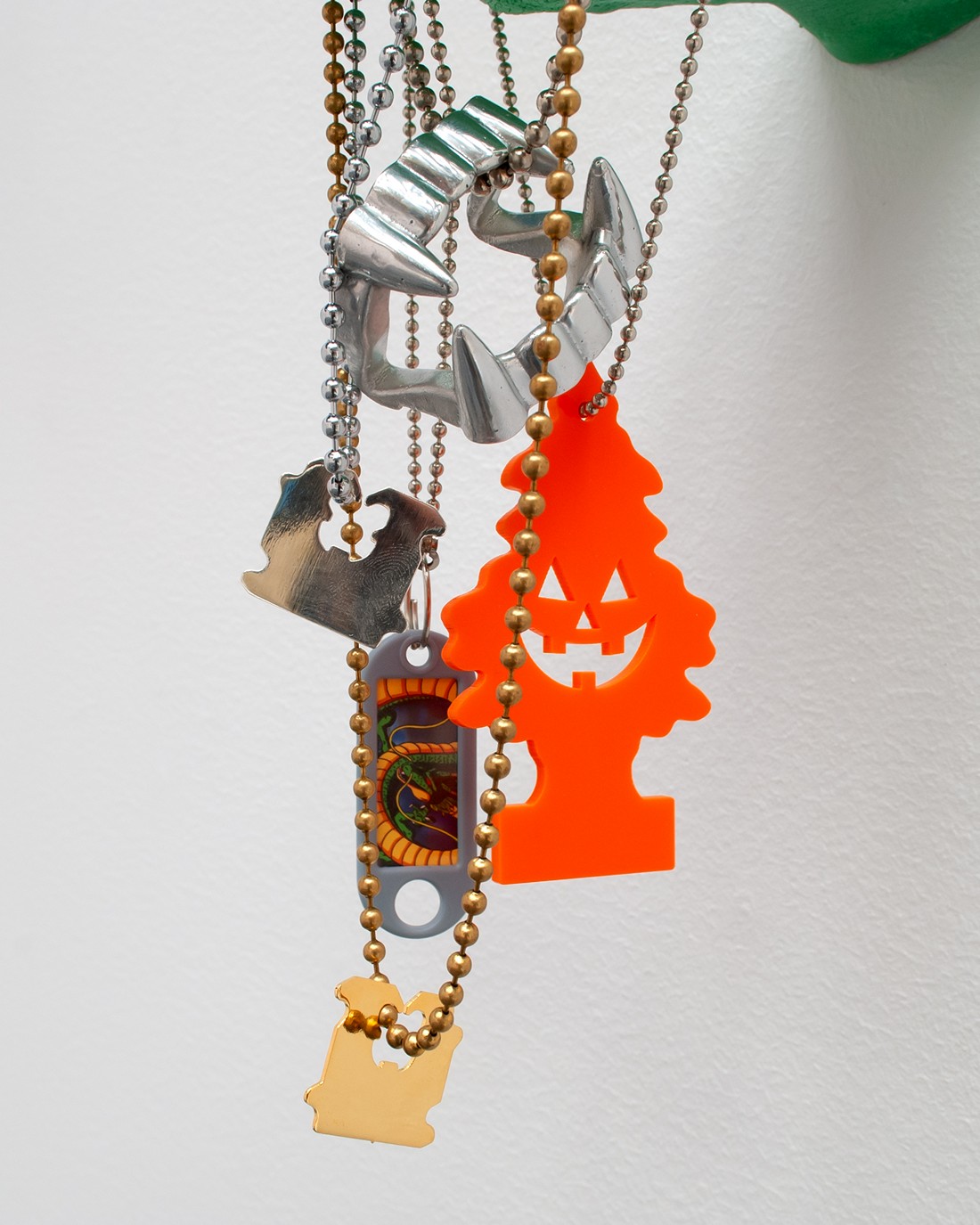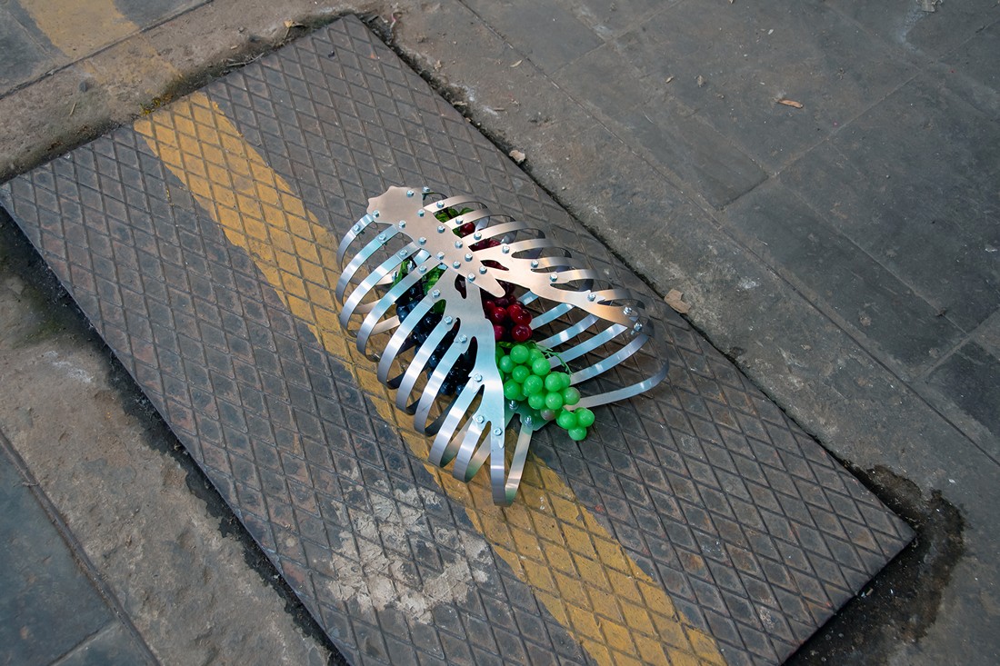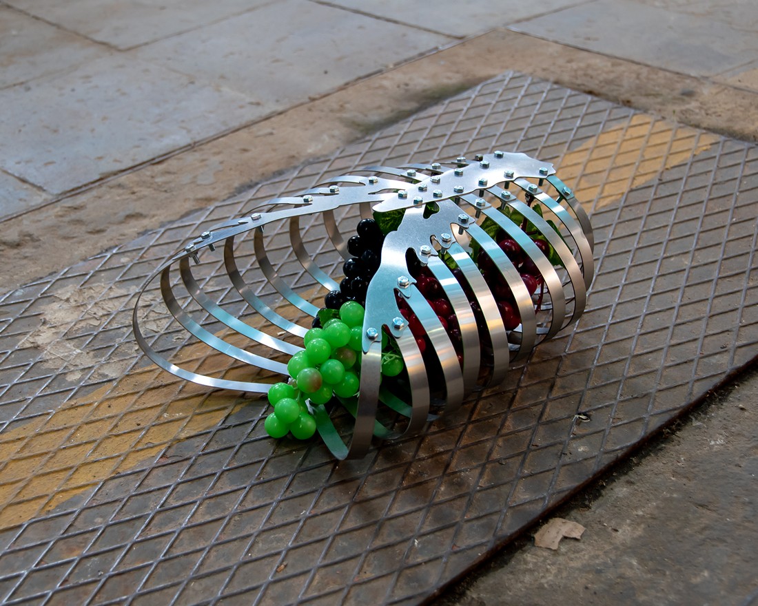 Your works seem to express a disrupted equipmentality; familiar at first glance, but removed from their daily moment. Likewise, contemporary objects bear motifs from the Middle Ages. These seem like artifacts from an impossible era when displayed in the timeless plane of the white cube. Do you feel a shift in the works between the gallery and the offsite? How does the setting change the meaning of the work for you?